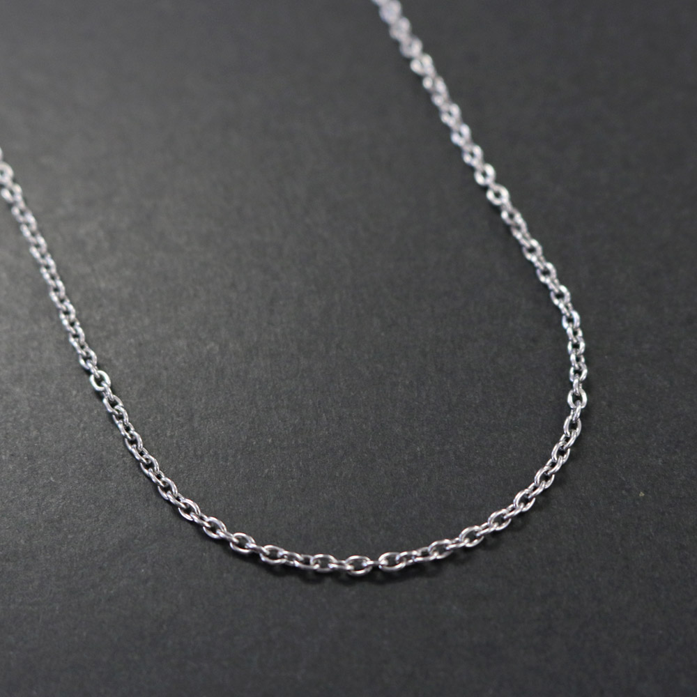 アレルギーが起きにくい特殊素材である医療用サージカルステンレス(SUS316L)を使用したシンプルチェーン。サビや変色にも強い為、耐久性の強さが求められるチェーンにうってつけの素材です。細めのアズキチェーンで着け心地も良くペンダントとの相性も良いです。