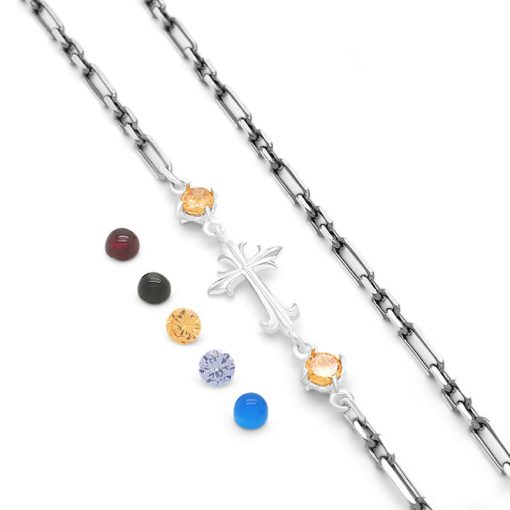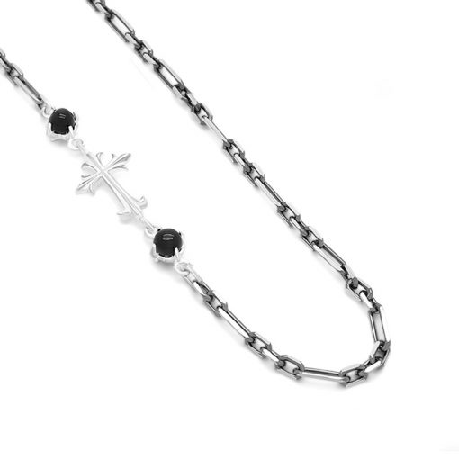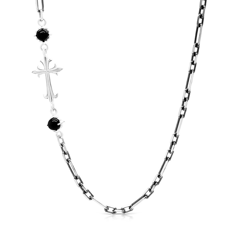 Re-PRODUCTION 限定コレクション FREE STYLEの人気アイテムデザインチェーンの限定バージョン。クロスを中心に二つのストーンが囲みます。石はお好きなものをリストからお選びください。特殊な形状のチェーンですのでインパクトのあるペンダントトップとのコーディネイトがお薦めです。長さ50㎝。