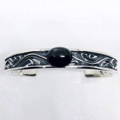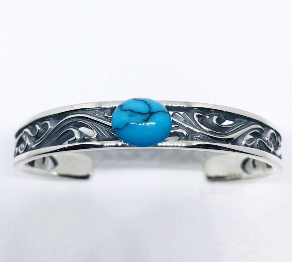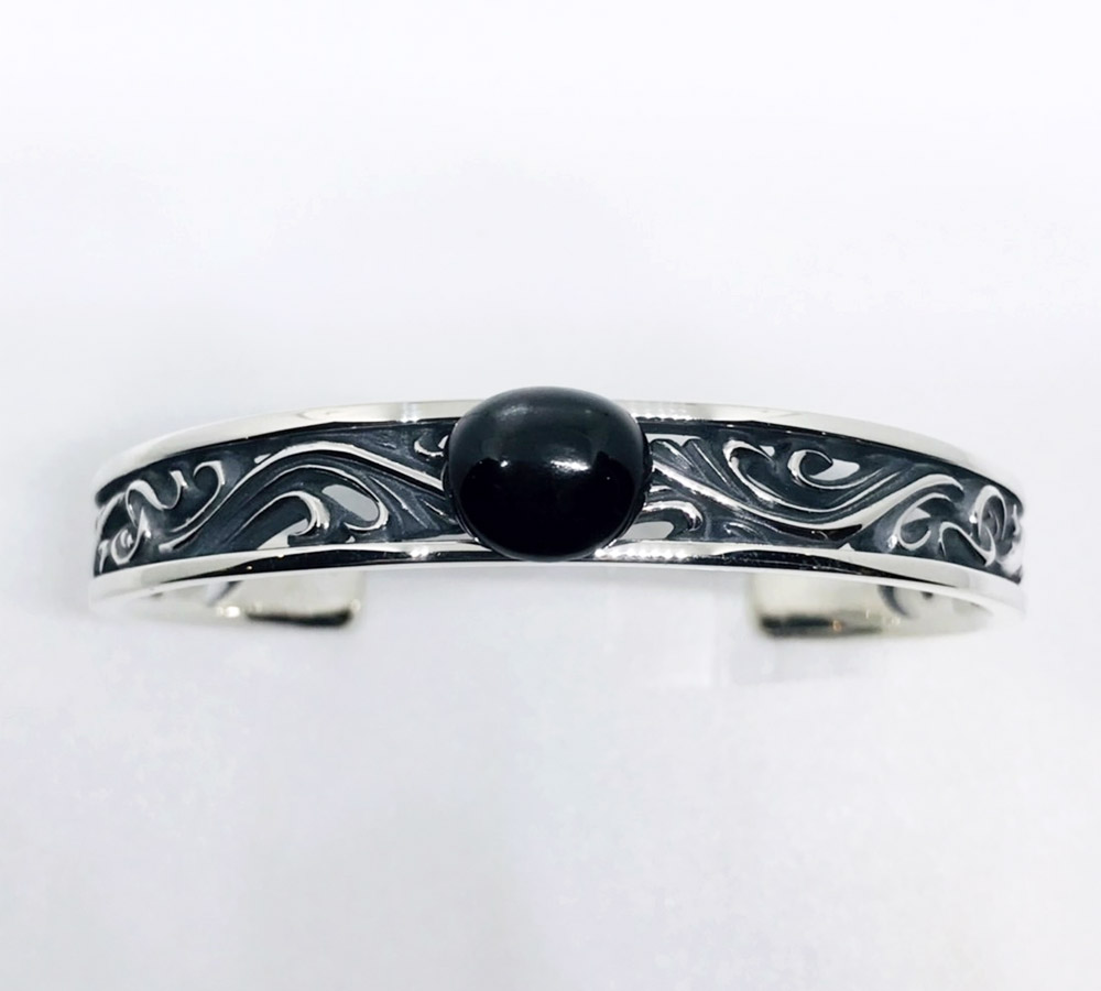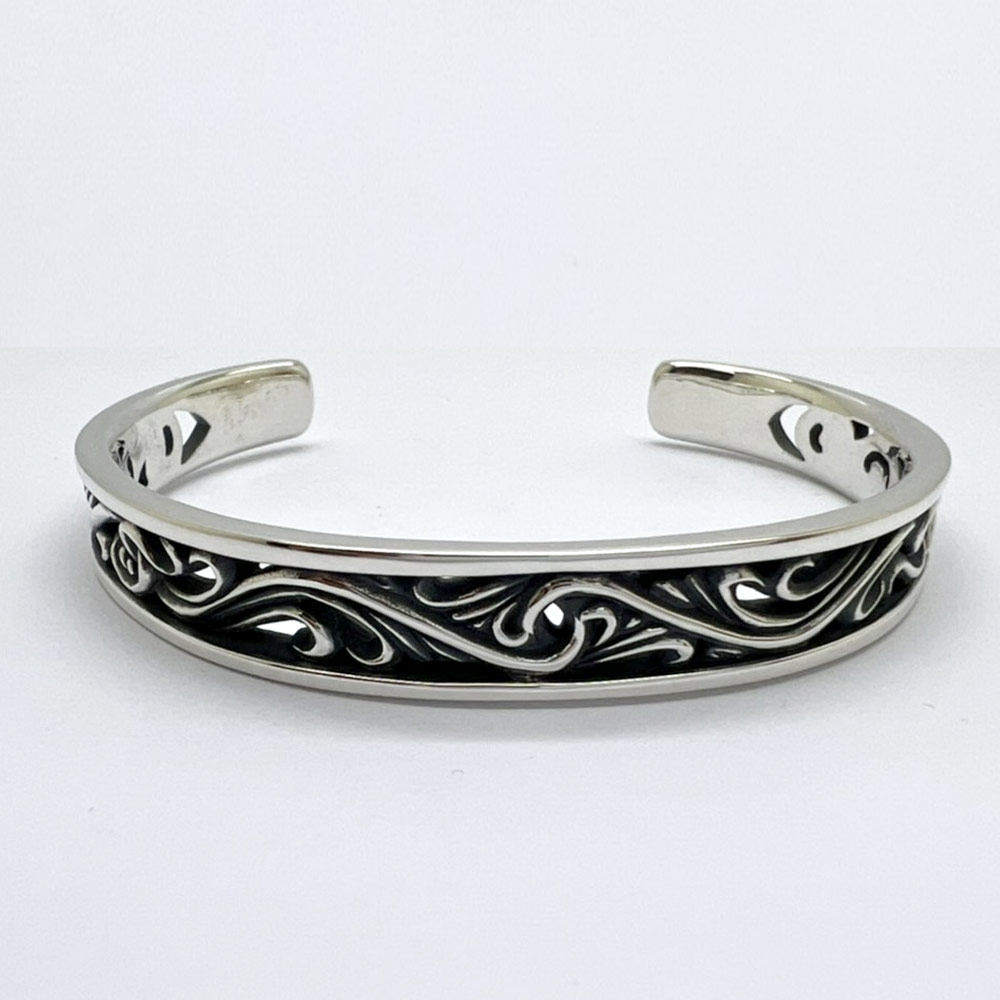 人気のFSR913のデザインをバングルに落とし込みました。特徴である透かし彫りの唐草模様は、指輪のデティールそのままに再現し、バングルとしての存在感は大満足の出来栄えです。バングルのトップ幅は約1㎝で全長は16㎝となっています。バングルのトップ部分には10×12㎜の天然石を選んで頂きセットする事も可能となっております。存在感のあるアラベスクをお楽しみ下さい。