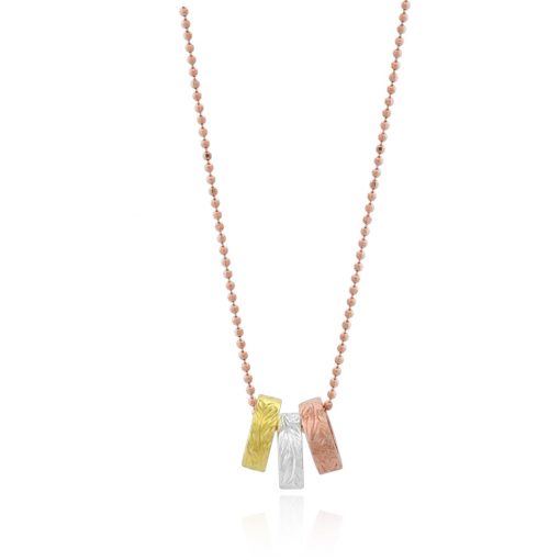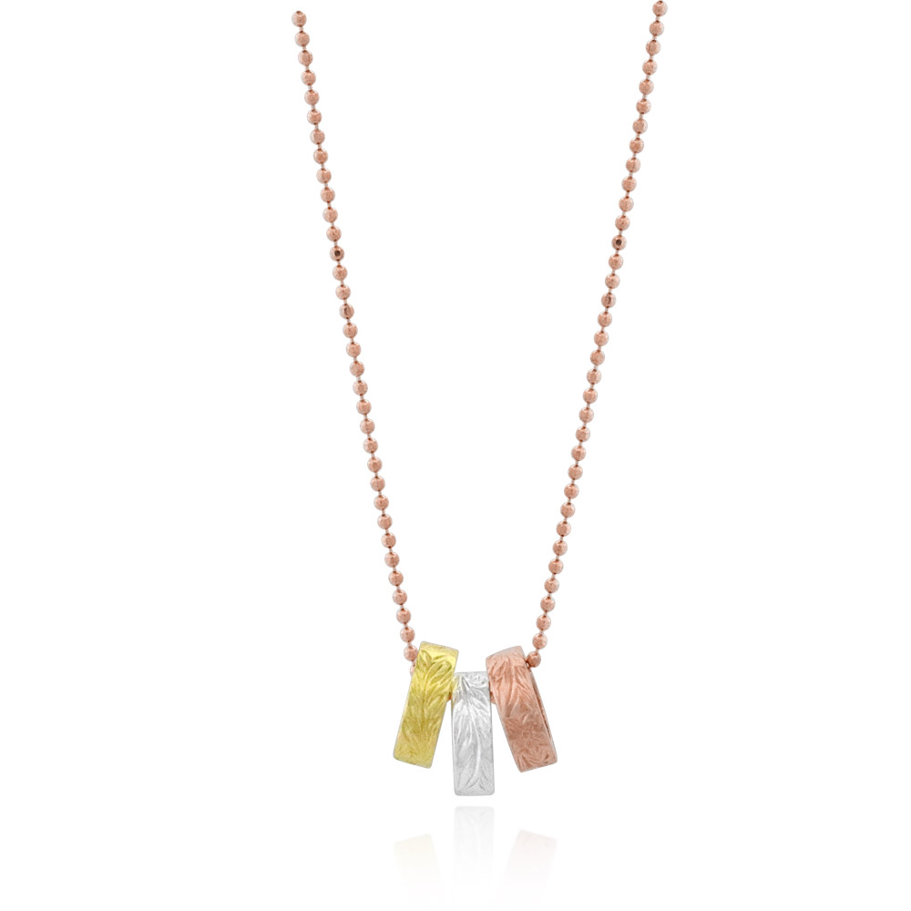 ピリアロハモチーフの3連リングトップ(シルバー、イエローゴールド、ピンクゴールド)ネックレス。ピリアロハとはハワイ語で「愛しあう夫婦」という意味。センターに彫られたハイビスカスには「あなたを信じます」という思いが込められており、そこからしなやかに伸びたマイレは古来より神が宿る聖なる植物として大切にされてきました。双葉が仲良く成長していく姿は「夫婦や家族の絆」を象徴しています。