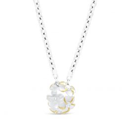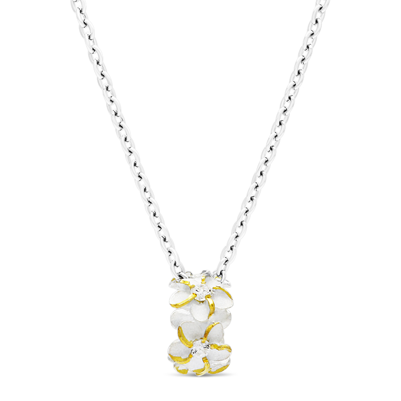 ハワイの伝統的なモチーフであるプルメリアを立体的に彫り起こした可愛らしいペンダントトップ。愛らしいプルメリアの表情をゴールドで陰影感を出すことでより立体的に表現されています。花の中央にはジルコニアをあしらい、キラキラと輝く可愛らしさを加えてます。