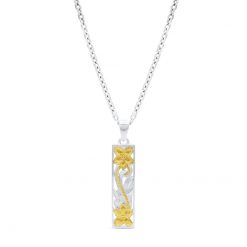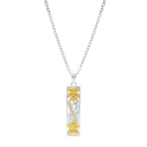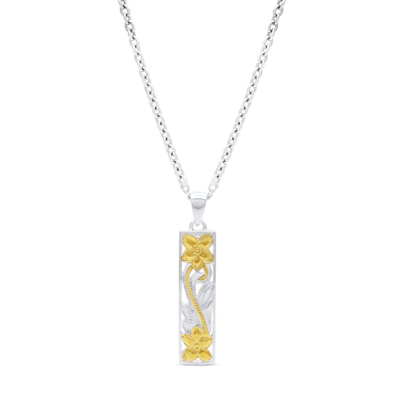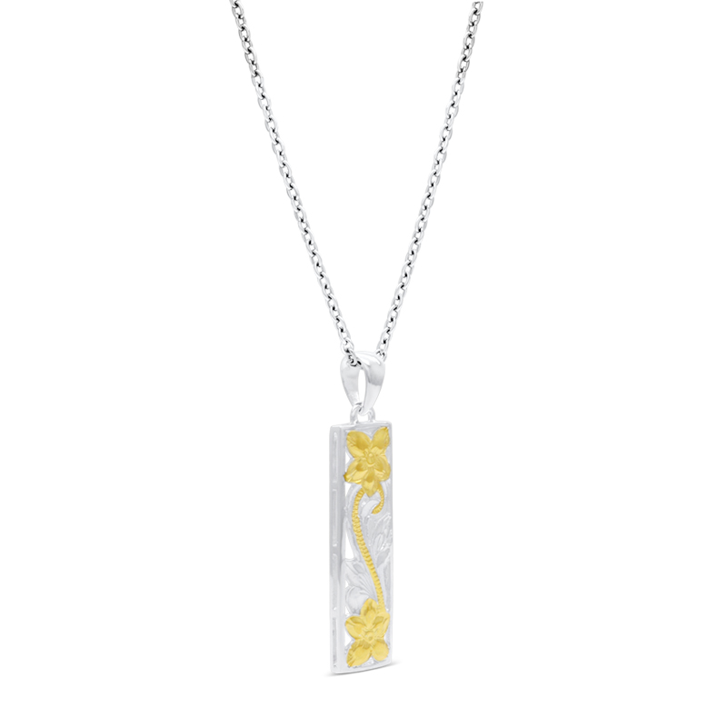 ハワイアンジュエリー独特の彫刻技術によって透かし彫りにされたプルメリア。存在感のあるプレートタイプのペンダントトップに大胆にかつ繊細に彫り込まれ、イエローゴールドのコーティングによって高級感を引き出しました。永遠に受け継がれる伝統的なモチーフのネックレスです。