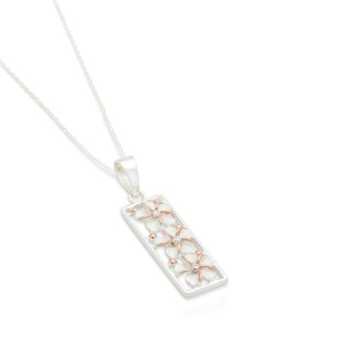 縦にプルメリアを3つデザインしたプレートネックレス。花びらの輪郭にピンクゴールドコーティングを施しており、可愛らしさを更に演出。女性をより魅力的に魅せてくれる意味合いが花言葉となっていますので、大切な人の幸せを願うものとして贈り物に最適なデザインとなっております。