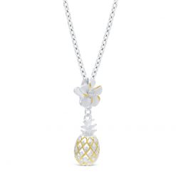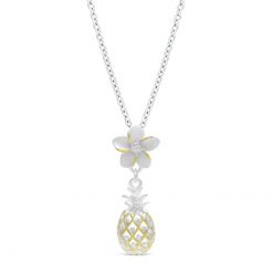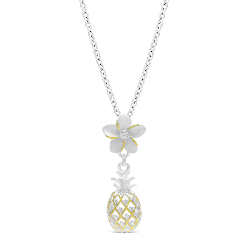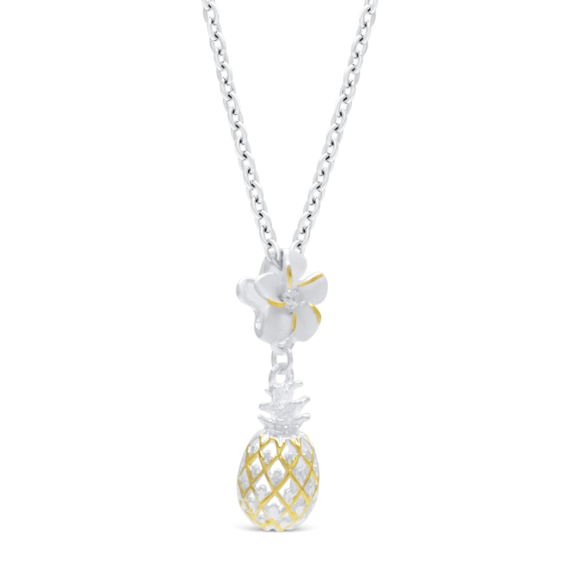 ハワイアンジュエリーでは定番となったパイナップルデザイン。立体的に作られたインパクト大のパイナップルと可愛らしいプルメリアの花が、まさにハワイアンジュエリーの王道らしい存在感を醸し出します。ゴールドコーティングを効果的に使いパイナップルらしさを表現しました。