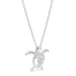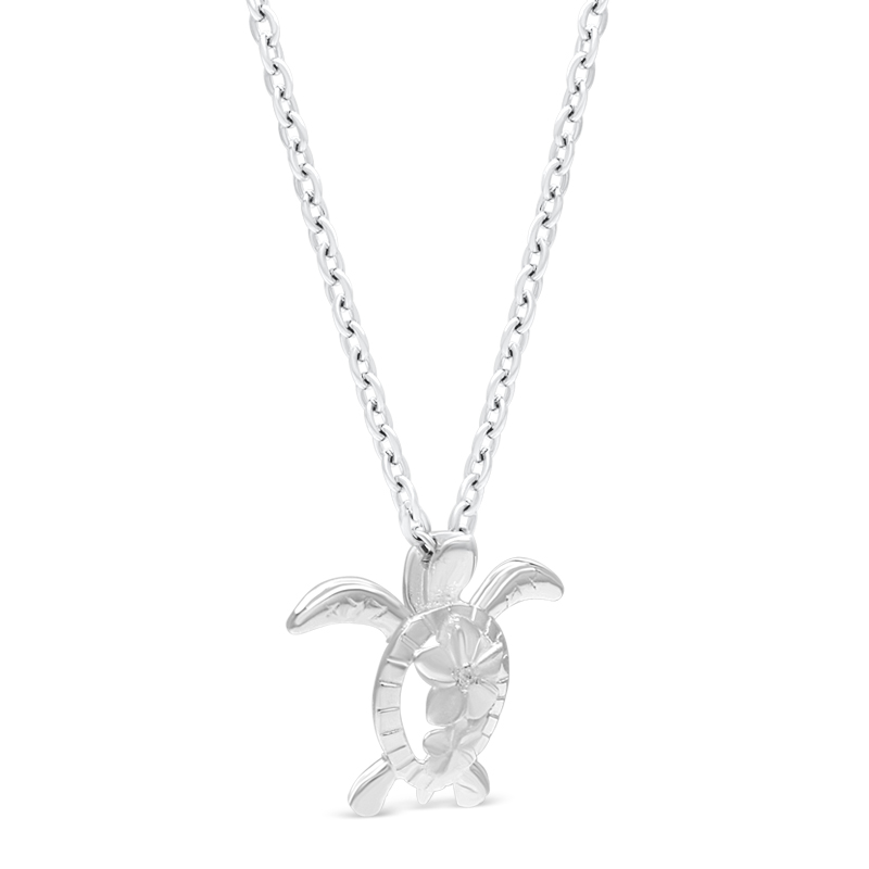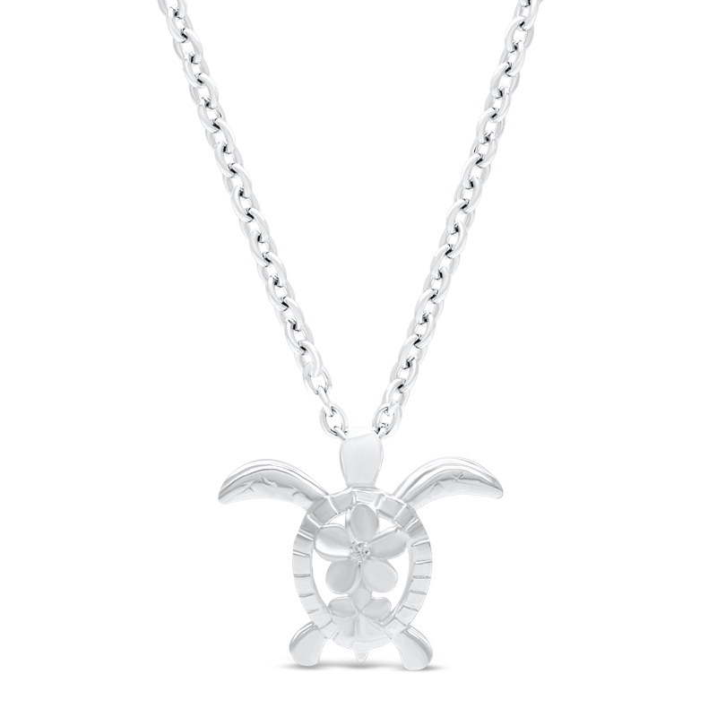 ハワイの人気モチーフホヌ(ウミガメ)をモチーフにした大人気ネックレス。ホヌの可愛らしい背中にプルメリアフラワーを立体的にあしらいました。プルメリアの中央にはジルコニアをセッティングし、シルバーの優しさが胸元に嬉しい夏にうってつけのネックレスです。