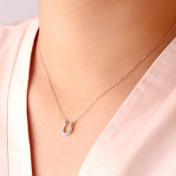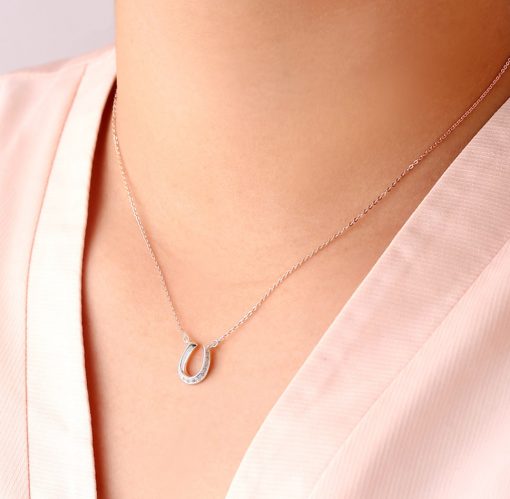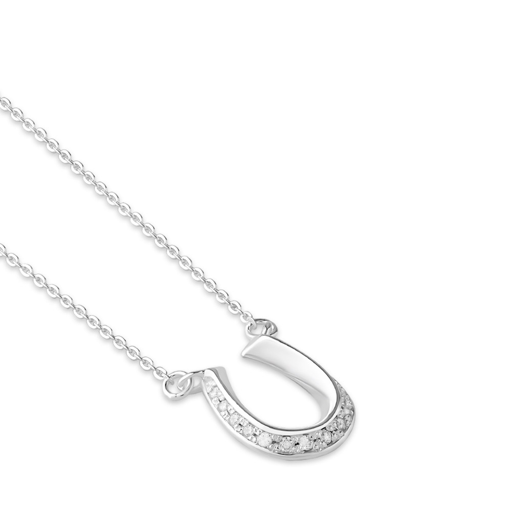 幸運を呼び込むと言い伝えのあるのモチーフホースシュー(馬蹄)をモチーフにしたレディースシルバーネックレス。シンプルなフォルムにキュービックジルコニアをセッティングし女性らしい印象に仕上げました。本体にセットされているアズキチェーンは40cmか45cmのお好きな長さでご使用いただけます。