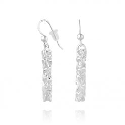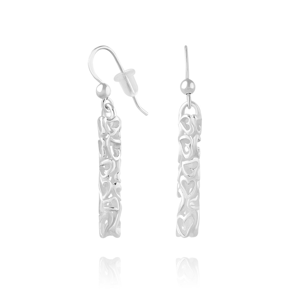 ハートモチーフを全体に彫刻したスティックタイプのシルバーピアス。甘すぎないデザインで合わせやすいアイテムとなっております。揺れ感を楽しめるフックタイプに仕上げました。両耳用2個セットでのご用意となります。