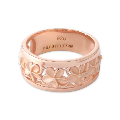 プルメリアをモチーフにしたレディースシルバーリング。適度なボリューム感のリングに施されたプルメリアを透かし彫りが指元を飾ります。プルメリアは大切な人の幸せを願う、幸せに導くといった意味があり神様が宿る花、身を護る花としても有名です。リング表面にはピンクゴールドのコーティングを施し女性らしい印象に仕上げました。