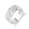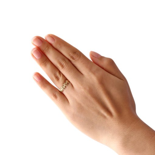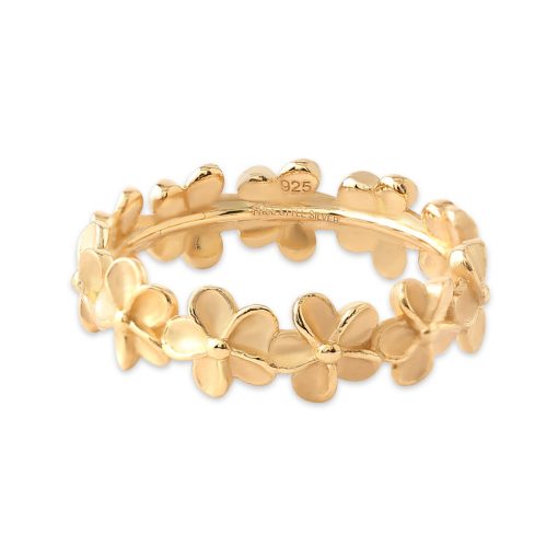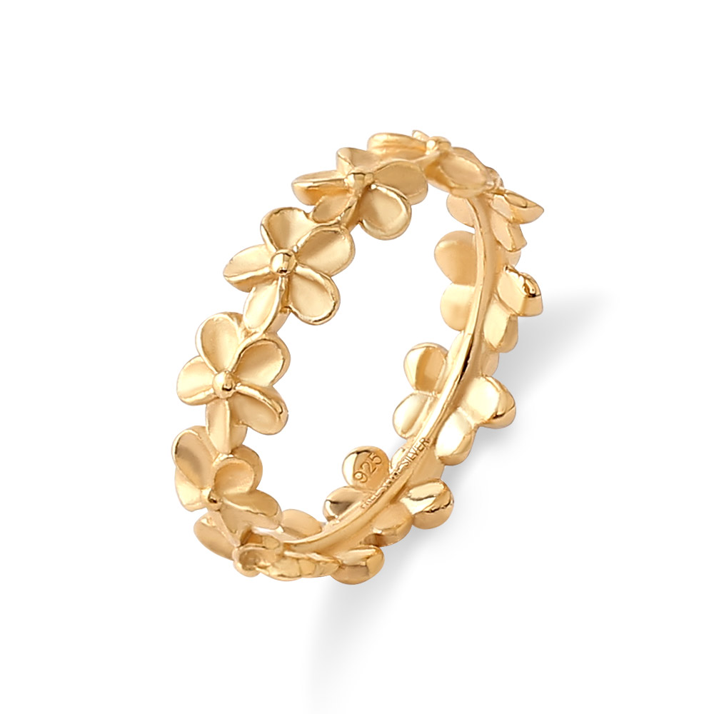 プルメリアモチーフの彫刻をリング全体に一周デザインしたレディースシルバーリング。プルメリアのモチーフのみで飾られたデザインが可愛らしい仕上がりとなっております。プルメリアは大切な人の幸せを願う、幸せに導くといった意味があり神様が宿る花、身を護る花としても有名です。リング表面にはゴールドのコーティングを施しました。