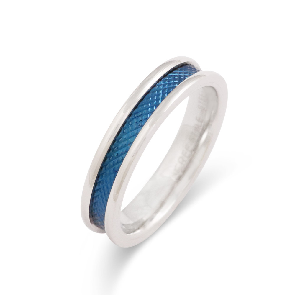 リング中央のラインにブルーカラーコーティングを施したステンレスリング。リングの内側を丸く仕上げてあるので着け心地がとても良いです。ステンレス素材なので金属アレルギーの方でも安心してお使いいただけます。リング内側には刻印も可能です。