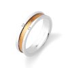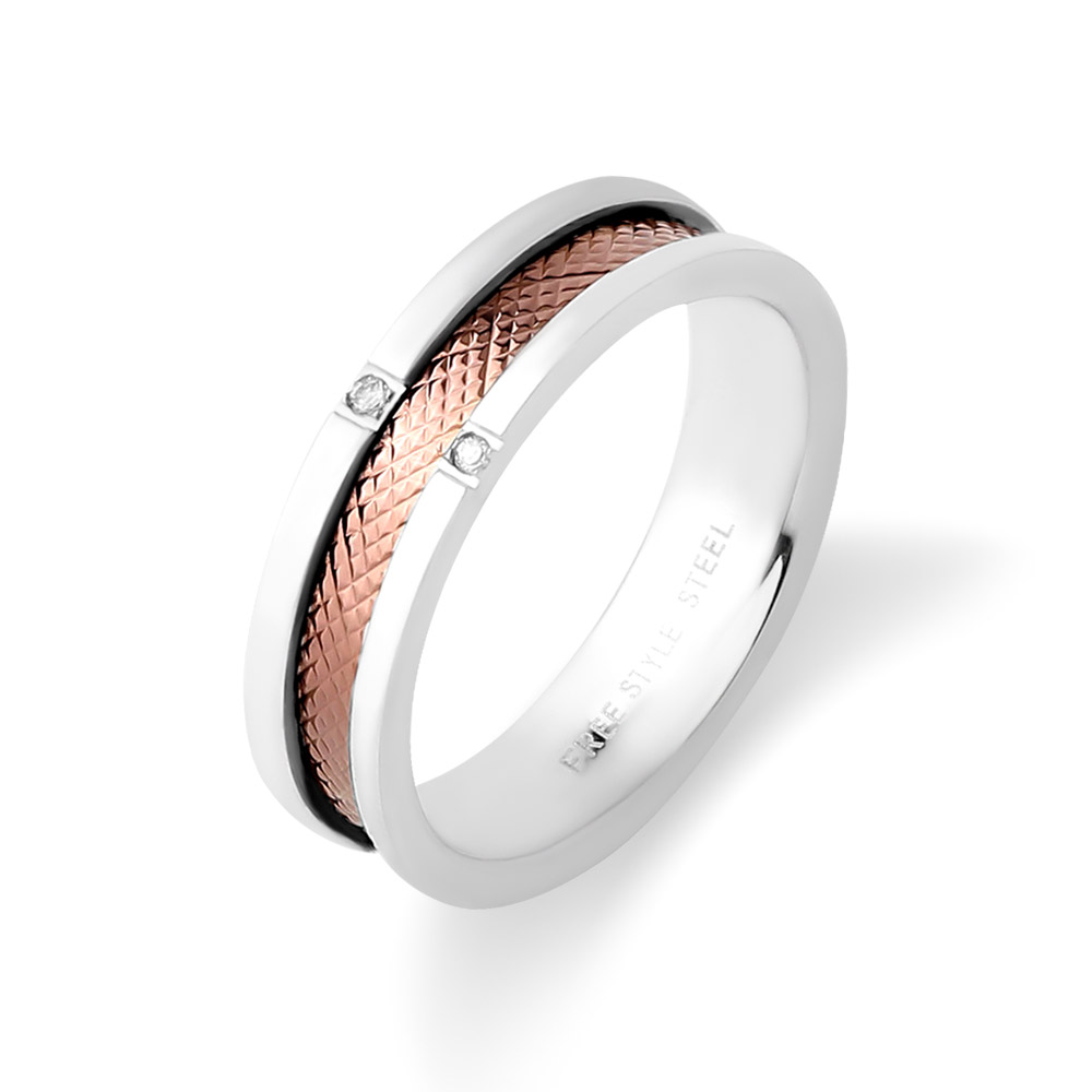 平打ちリングの中央にブラウンカラーコーティングを施したステンレスリング。中央に2石のキュービックジルコニアをセットしました。リングの内側を丸く仕上げてあるので着け心地がとても良いです。ステンレス素材なので金属アレルギーの方でも安心してお使いいただけます。リング内側には刻印も可能です。