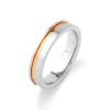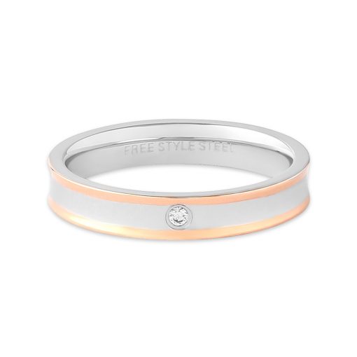 中央をくぼませたリングの両サイドにピンクゴールドのカラーコーティングを施したステンレスリング。ワンポイントで1石キュービックジルコニアをセットしました。医療用にも用いられる素材を使用しているので金属アレルギーの方も安心してお使い頂けます。