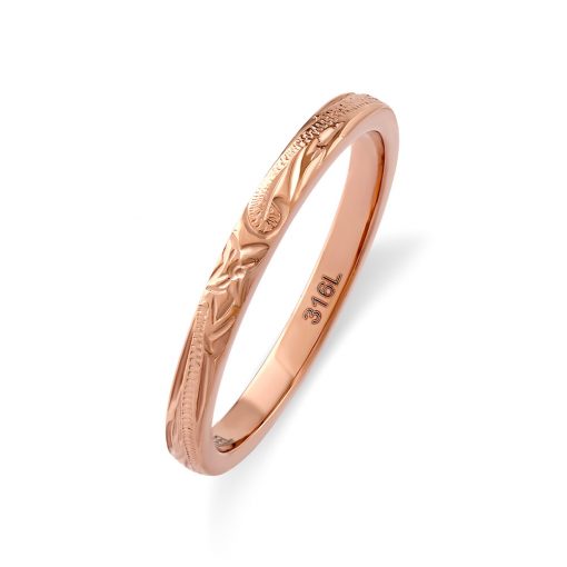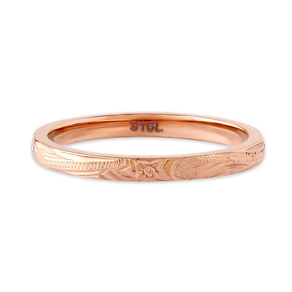 リング表面にハワイアンジュエリーの代表的なモーチーフ「プルメリア」と「マイレ(葉)」をデザインしたステンレスリング。表面には女性らしいピンクゴールドカラーのコーティングを施しました。医療器具に使われる素材と同じステンレスを使用しているので、金属アレルギーの方でも安心してご着用いただけます。リング内側には記念日などの刻印も可能です。