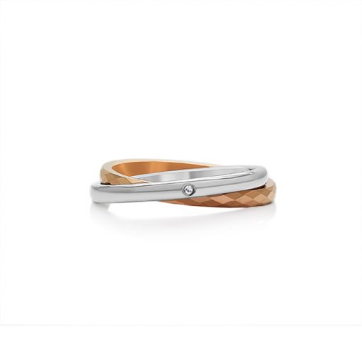 シンプルなタングステンリングカッティングにを施し、センターストーンが印象的なステンレスリングの2本を繋ぎ合せ、二連リングの独特の存在感が美しい。