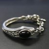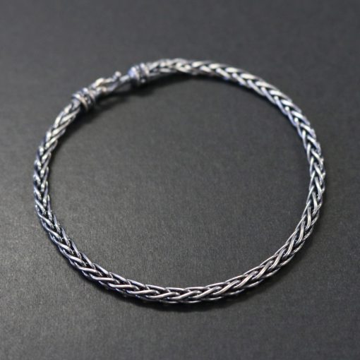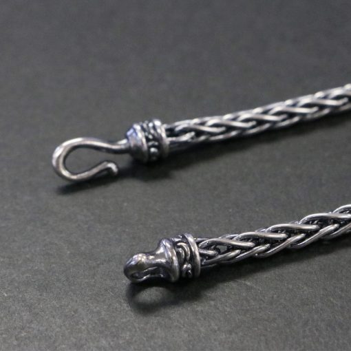 個性的なスネークチェーンを燻したシルバーブレスレット。シルエットはシンプルなデザインに見えるチェーンですが、4本の銀丸線を互い違いに編み込んだ繊細なデザインとなっています。様々なファッションでお楽しみ頂けるよう、燻し銀特有の立体感と高級感のある仕上げにし、留め具にはアイビー柄の彫刻を入れました。