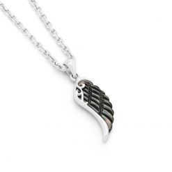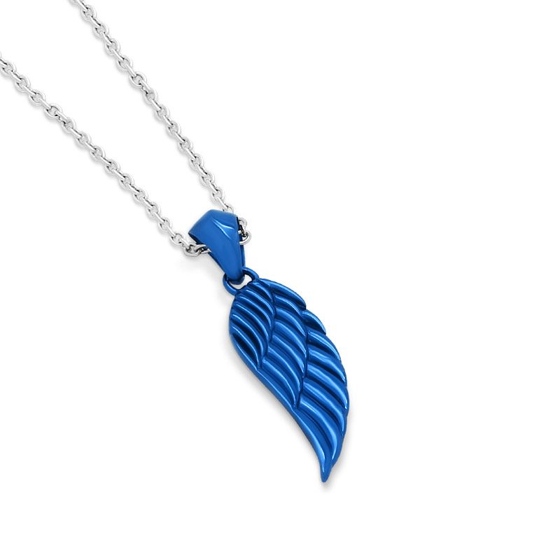 羽をモチーフにしたステンレスペンダントにダークブルーカラーのコーティングを施したステンレスペンダント。羽のモチーフはフリースタイルのデザインの中でも、長い間人気のモチーフとなっております。ステンレス素材なので金属アレルギーの方でも安心してお使いいただけます。