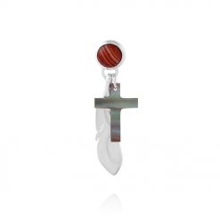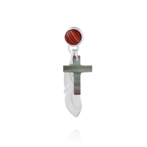 フェザーモチーフとクロス型にかたどったブラックシェルを組み合わせたシルバーピアス。ポスト部分にはレッドレースアゲートをセットしました。片耳用(1個売り)の価格となっております。