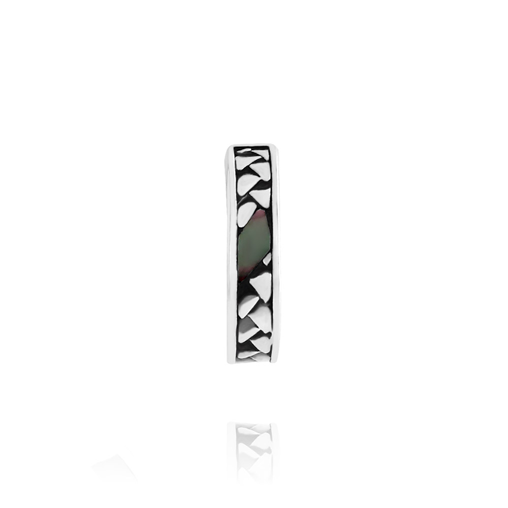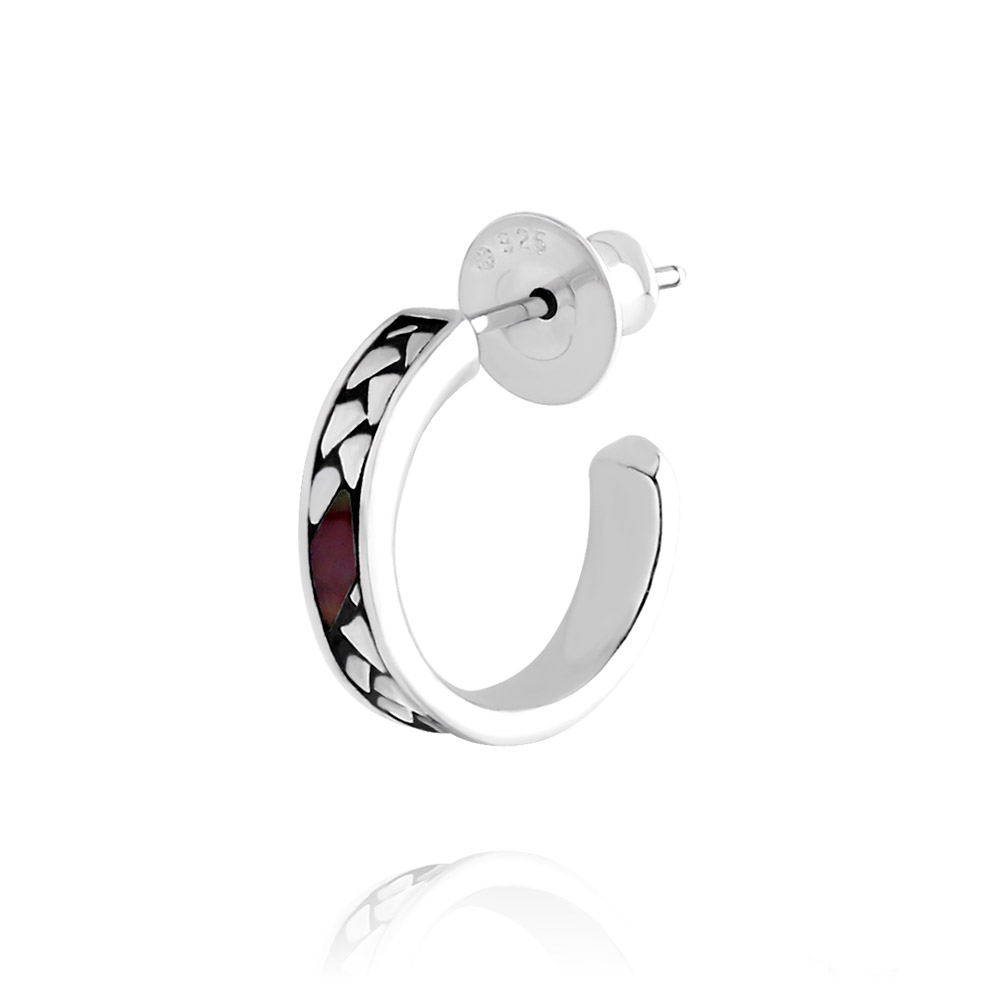 シルバーを編み込んだ様なデザインのシルバーピアス。シンプルな一直線の指輪に目を引くワンポイントのブラックシェルをはめ込む事で存在感と高級感を出しています。アンティーク調に仕上げた銀と黒蝶貝とのコンビネーションが楽しめるピアスです。片耳用(1個売り)の価格となっております。