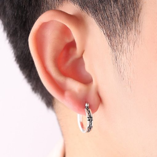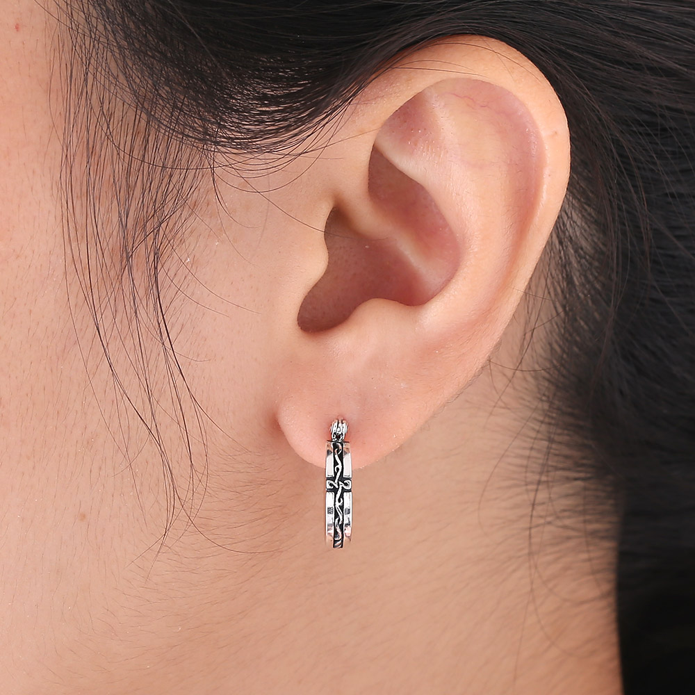 中央でクロスしたアラベスク(唐草模様)をデザインしたシルバーフープピアス。彫刻部分に施されたいぶしが作品の立体感と細部までの陰影をより一層際立たせています。ペアアイテムのFSE918-Wもお勧めです。片耳用(1個売り)の価格となっております。
