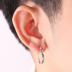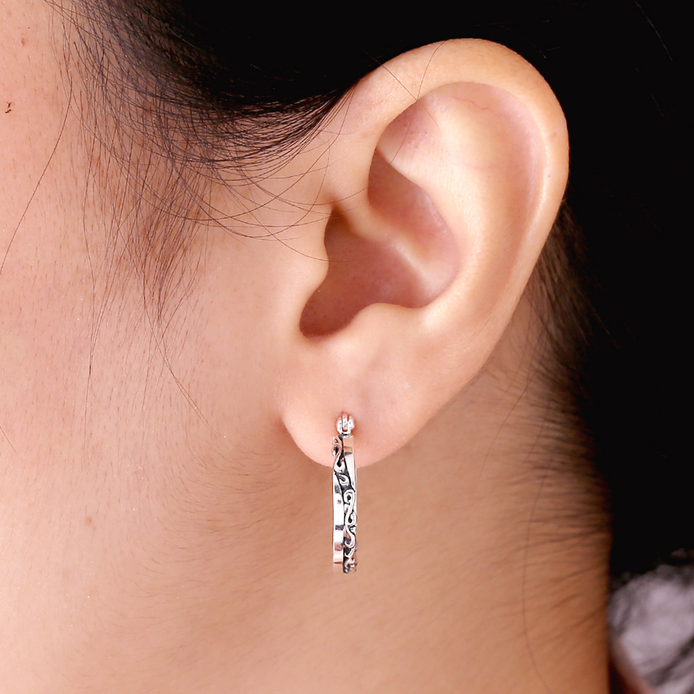 透かし彫りのアラベスク(唐草模様)を斜めに配置したシルバーフープピアス。彫刻部分に施されたいぶしが作品の立体感と細部までの陰影をより一層際立たせています。ペアアイテムのFSE920-Wもお勧めです。片耳用(1個売り)の価格となっております。