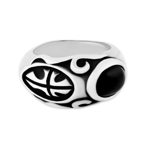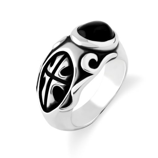 FREE STYLEを代表する石ブラックスターを使用したシルバーリング。アシンメトリー(左右非対称)なデザインにクロスモチーフを彫刻しました。ボリューム感と存在感に目が行きます。メンズリングらしい躍動感のあるデザインが魅力です。