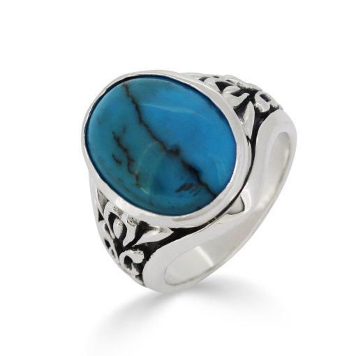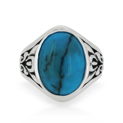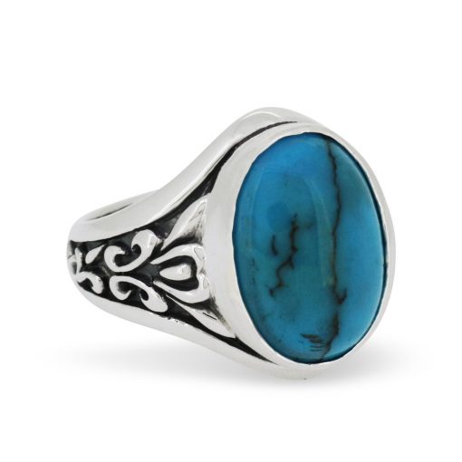 天然ターコイズを大胆にあしらったシルバーリング。サイドにはアンティークを思わせるアラベスクを彫り込み、重厚ながらも適度なボリューム感のある仕上がりに。
