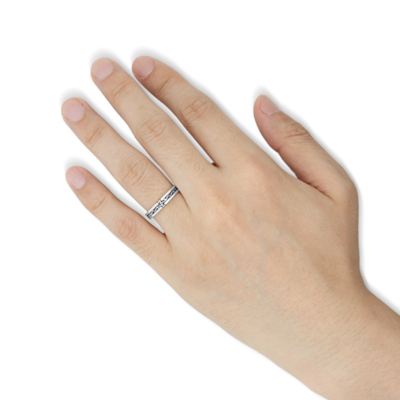 中央に配されたクロスの緻密に彫り込まれたレリーフが美しいシルバーリング。デザインの細やかさから飽きのこない表情と、使い込むたびに自分らしい表情に仕上がっていくシルバーの独特な存在感が嬉しいリングです。シンプルなフォルムは着け心地も良く、重ね着けにも相性が良いです。