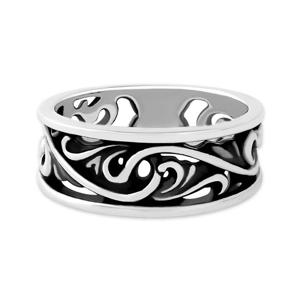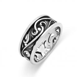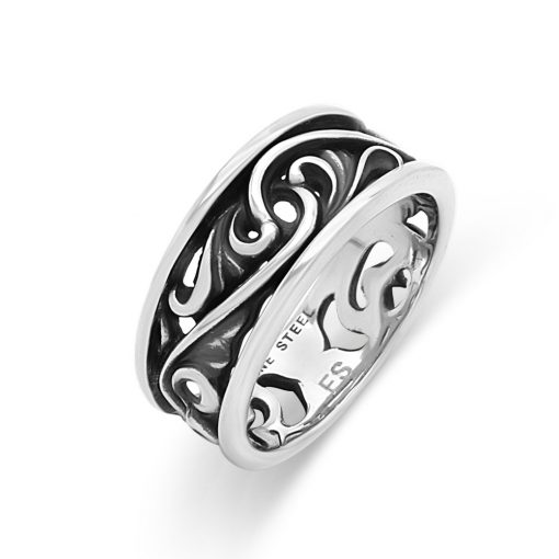 ステンレス素材には珍しい透かし彫りの唐草模様で表現されたリング。上品な装飾が指輪の表情に陰影感と曲線の奏でる美しいモチーフが、硬質なステンレス素材との相性抜群のデザイン。変色しない素材の為デイリーユースにも物怖じせずに使う事ができ、とても便利です。FREE STYLEらしい大胆なデザインのステンレスリングです。
