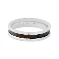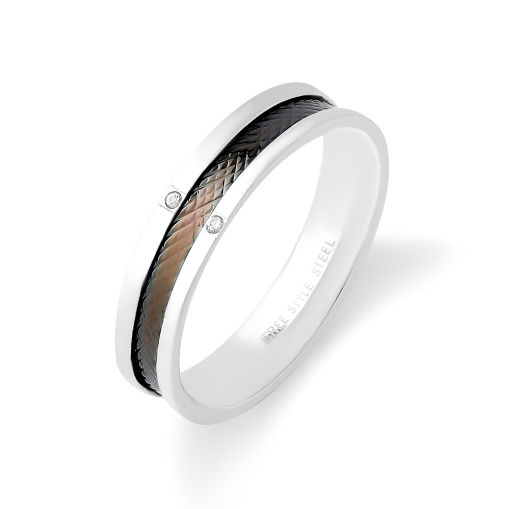 平打ちリングの中央にブラックカラーコーティングを施したステンレスリング。中央に2石のキュービックジルコニアをセットしました。リングの内側を丸く仕上げてあるので着け心地がとても良いです。ステンレス素材なので金属アレルギーの方でも安心してお使いいただけます。リング内側には刻印も可能です。