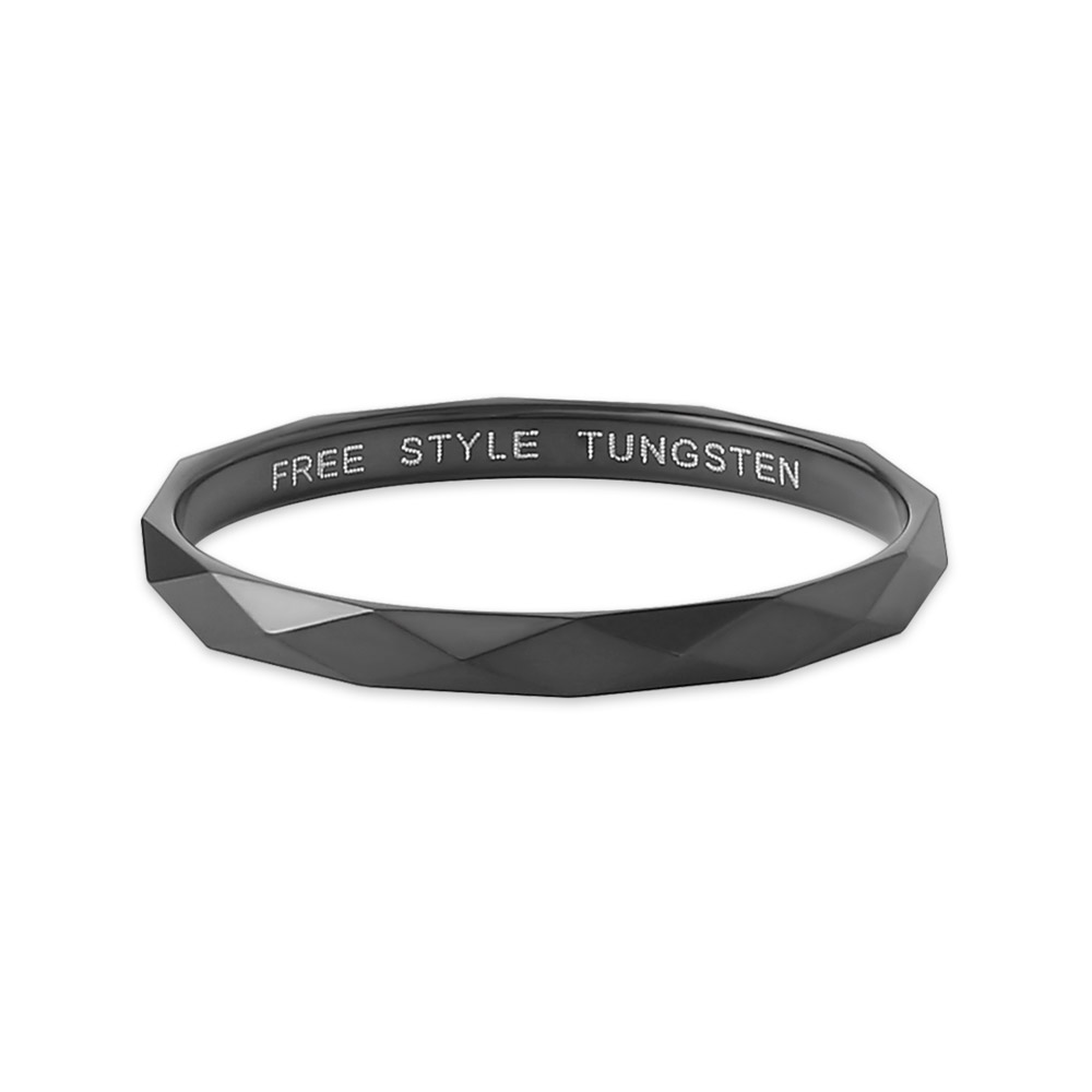 ダイアカットされたタングステンにブラックコーティングを施したリング。約2mm幅の指輪に細かくカットされたデザインと、コーディネートし易いブラックカラーは様々なファッションで活用可能。現在ご使用中の指輪に重ね着け用としても楽しめます。プレゼントの場合はリング内側に刻印も可能です。