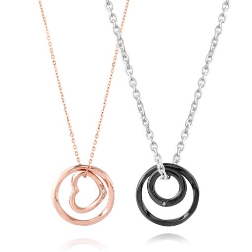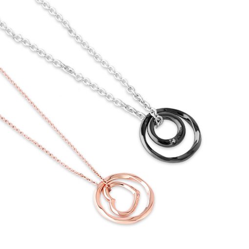 ツイストをかけたリングとオープンハートを組み合わせたシルバーペアネックレス。メンズにはブラックカラーのコーティングを施しダイヤモンドを1石、レディースはピンゴールドカラーでジルコニアとダイヤモンドを1石セットしました。付属のチェーンはメンズは45cmか50cm、レディースは40cm~45cmのお好きな長さでお使い頂けます。
