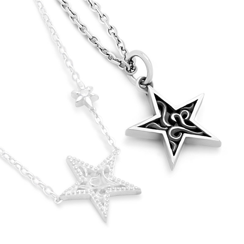 大人気のスターモチーフをFREE STYLEらしく細やかなモチーフであしらったシルバーネックレス。メンズタイプはいぶしのブラック仕上げ、レディースタイプはホワイト仕上げになっています。2つの星を重ねる事で中央にハートが浮き上がるデザインです。女性用のチェーンの中にさり気なく光る星のチャームはダイヤモンドが一石セットされていて、長さは40㎝から5㎝アジャスターが付属します。