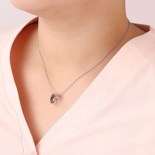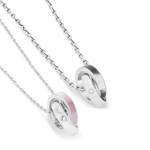ブラックシェル、ピンクシェルがあしらわれたリングと、センターストーンが印象的なシンプルステンレスリングの2本を繋ぎ合せ、2連リングトップに仕立てました。2連ペンダントの持つシンプルかつエレガントな雰囲気が魅力的です。変色やアレルギーも気にせず毎日使いたくなる大人気ネックレスです。