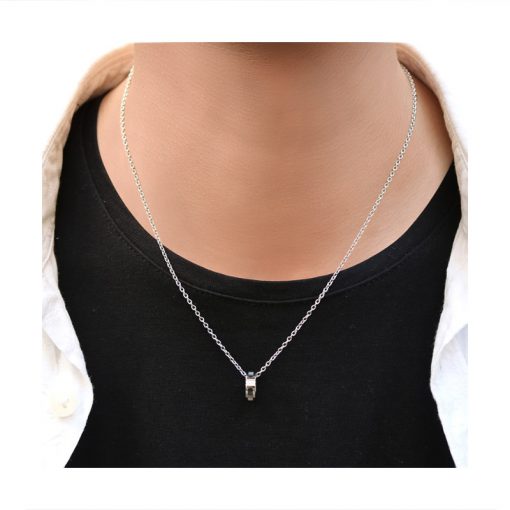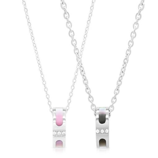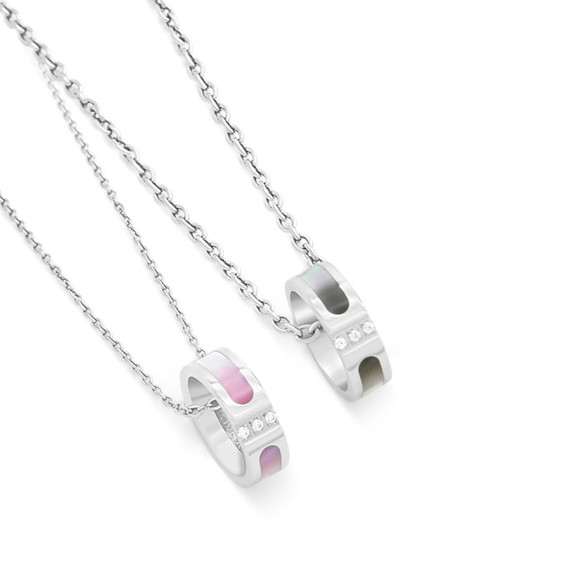 アレルギー、変色に強いサージカルステンレスのボディに、光の加減で色合いが変わるブラックシェル、ピンクシェルをあしらったペアネックレス。中央にはジルコニアのラインストーンを配置し、甘くなり過ぎないようにデザインしました。
