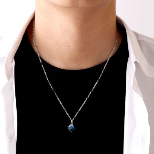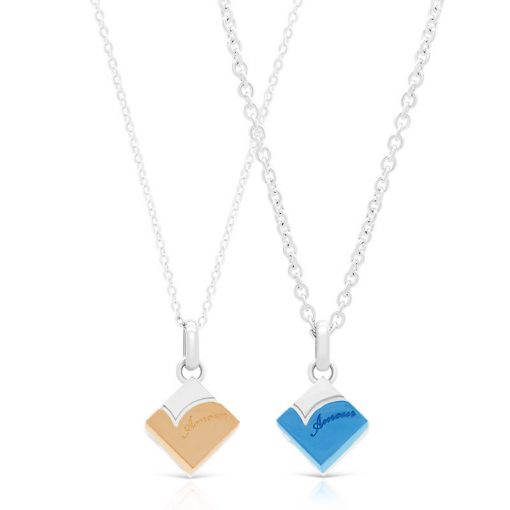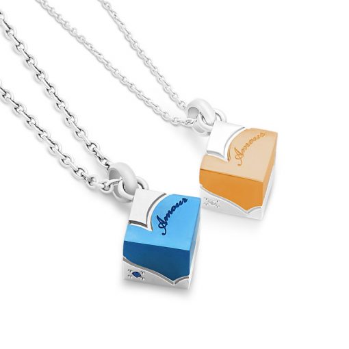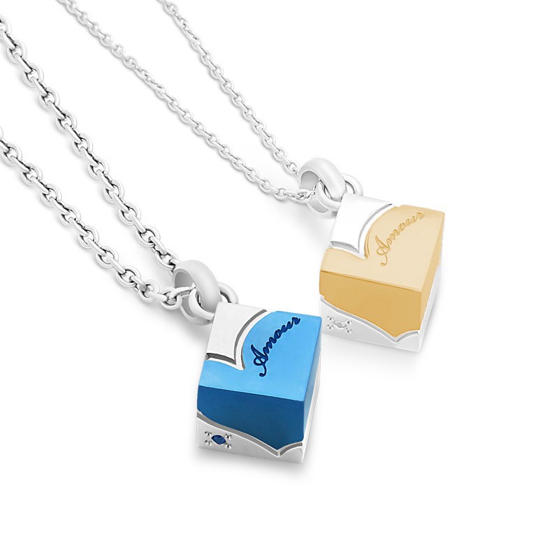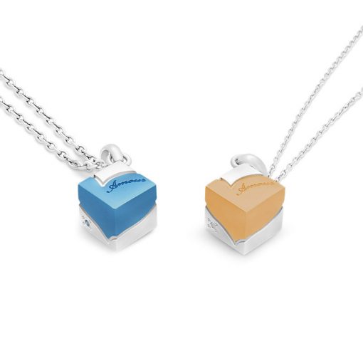 立体的なキューブペアネックレスにブラックのハートのデザインをしました。ステンレスの上品な輝きに、チタニウムコーティングのハートがさりげないおしゃれなペアネックレス。