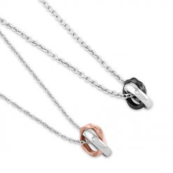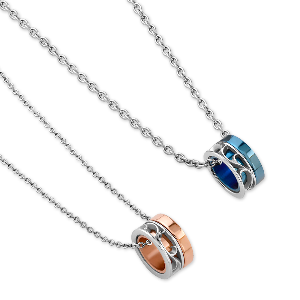 リングの半分にアラベスク(唐草模様)を彫刻したステンレスペンダント。医療器具に使われる素材と同じステンレスを使用しているので、金属アレルギーの方でも安心してご着用いただけます。付属のチェーンはレディースは40cmか45cm、メンズは45cmと50cmのお好きな長さでお使い頂けます。