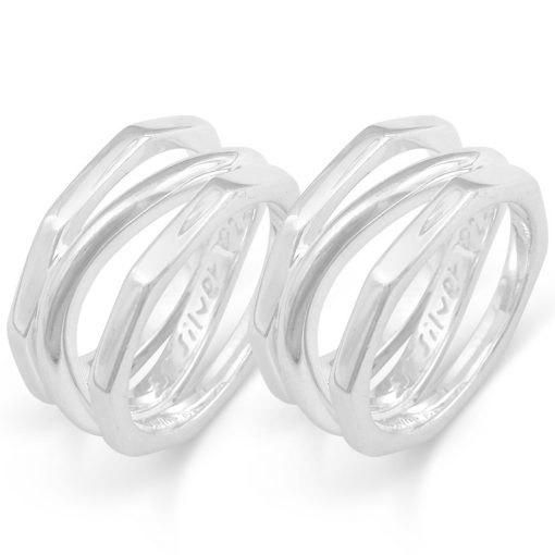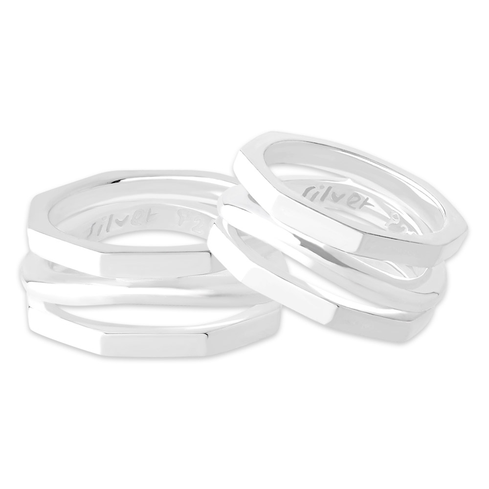 大胆な八角形のデザインをベースに重なり合う3層のシルバーリングが織りなすシンプルなデザインのペアリング。着けるごとに肌に馴染んでゆくシルバーの優しい光沢と、デザインの独創性が楽しいリング。シルバーだからこそできる素敵なデザイン。個性的なお二人のペアリングにお薦めです。