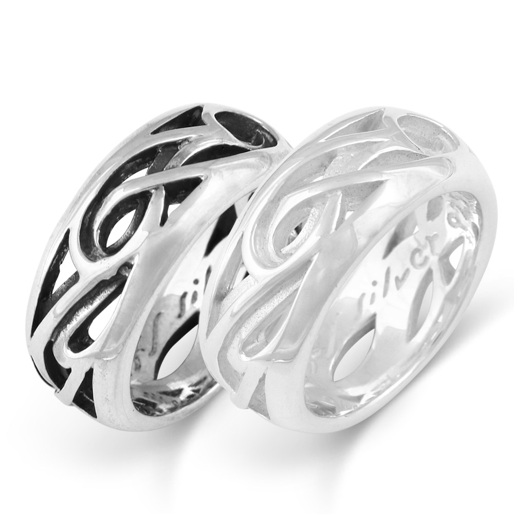 美しい曲線の織りなす3層のレイヤーがリングに立体感を生み出し、陰影感をより強調するデザインになっております。継ぎ目無く一周全てにモチーフを彫刻することで、デザインの一体感を生み出しました。レディースは白仕上げで明るい表情、メンズはいぶし加工による深い陰影感を表現しました。