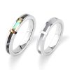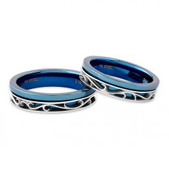 リングの半分にアラベスク(唐草模様)を彫刻したステンレスペアリング。それぞれのリングの表面にはブルーカラーのコーティングを施しました。医療器具に使われる素材と同じステンレスを使用しているので、金属アレルギーの方でも安心してご着用いただけます。リング内側には記念日などの刻印も可能です。