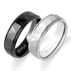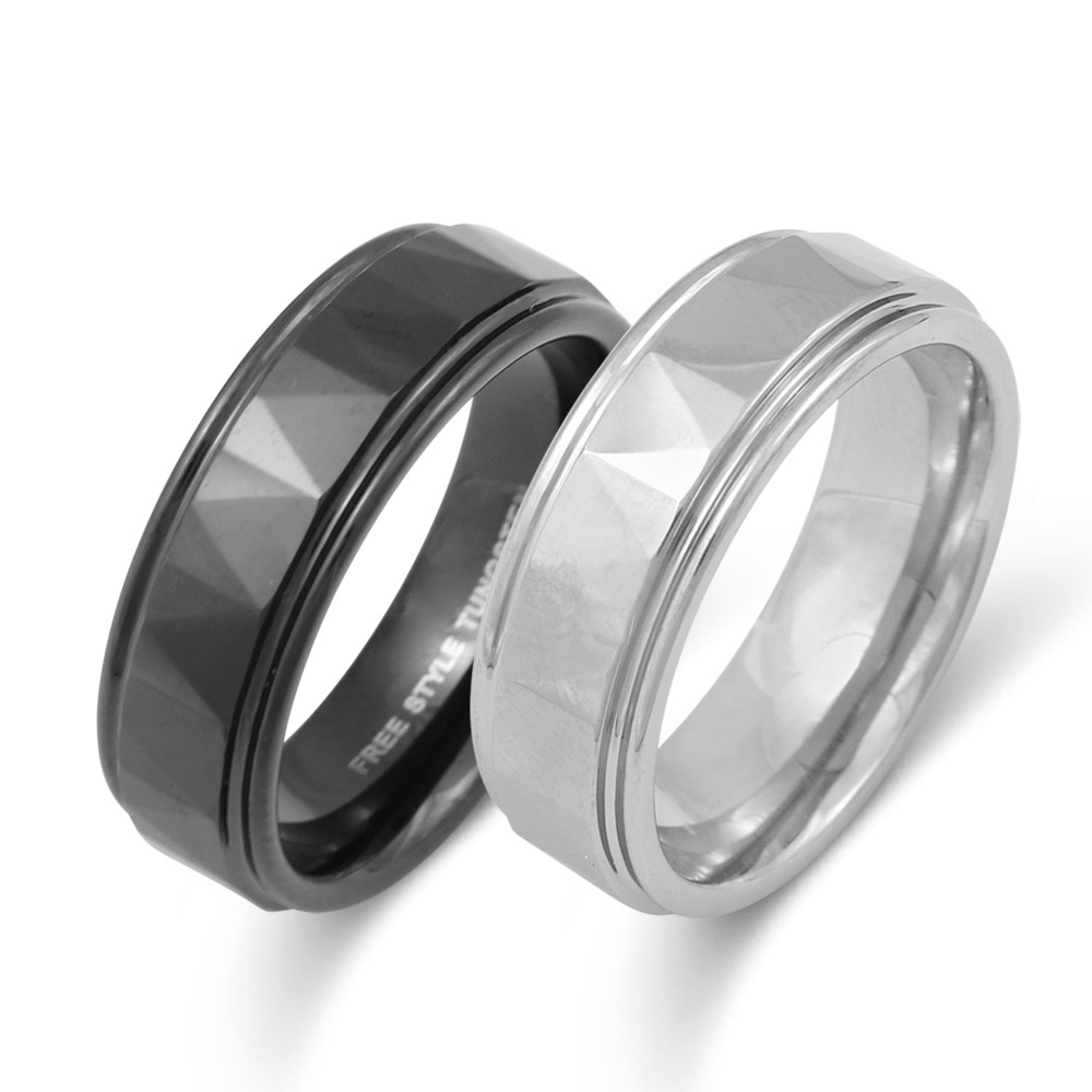 厚みのあるタングステンペアリング。大胆なカッティングでシャープな輝きが印象的です。重厚感のあるボディが着け心地の良いペアリングです。メンズはブラックチタンコーティング、レディースはタングステンのシンプルなカラーでスッキリとした印象です。