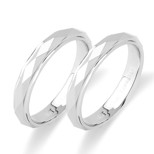 タングステンを代表する人気ペアリング。傷が付きにくいタングステンだから表現できるシャープなカッティングが洗練された美しさと存在感を引きだします。シンプルと輝き、このリングの人気はここにあります。メンテナンスのいらない素材なのもタングステンの特徴です。こちらはタングステンの無垢のカラーでご紹介です。他にも2色カラー展開があります。
