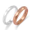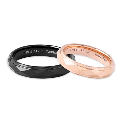 タングステンを代表する人気ペアリング。傷が付きにくいタングステンだから表現できるシャープなカッティングが洗練された美しさと存在感を引きだします。シンプルと輝き、このリングの人気はここにあります。メンテナンスのいらない素材なのもタングステンの特徴です。ブラックのチタンコーティングをしたメンズと、可愛らしいピンクゴールドカラーのレディースで個性派なペアリングとなっております。