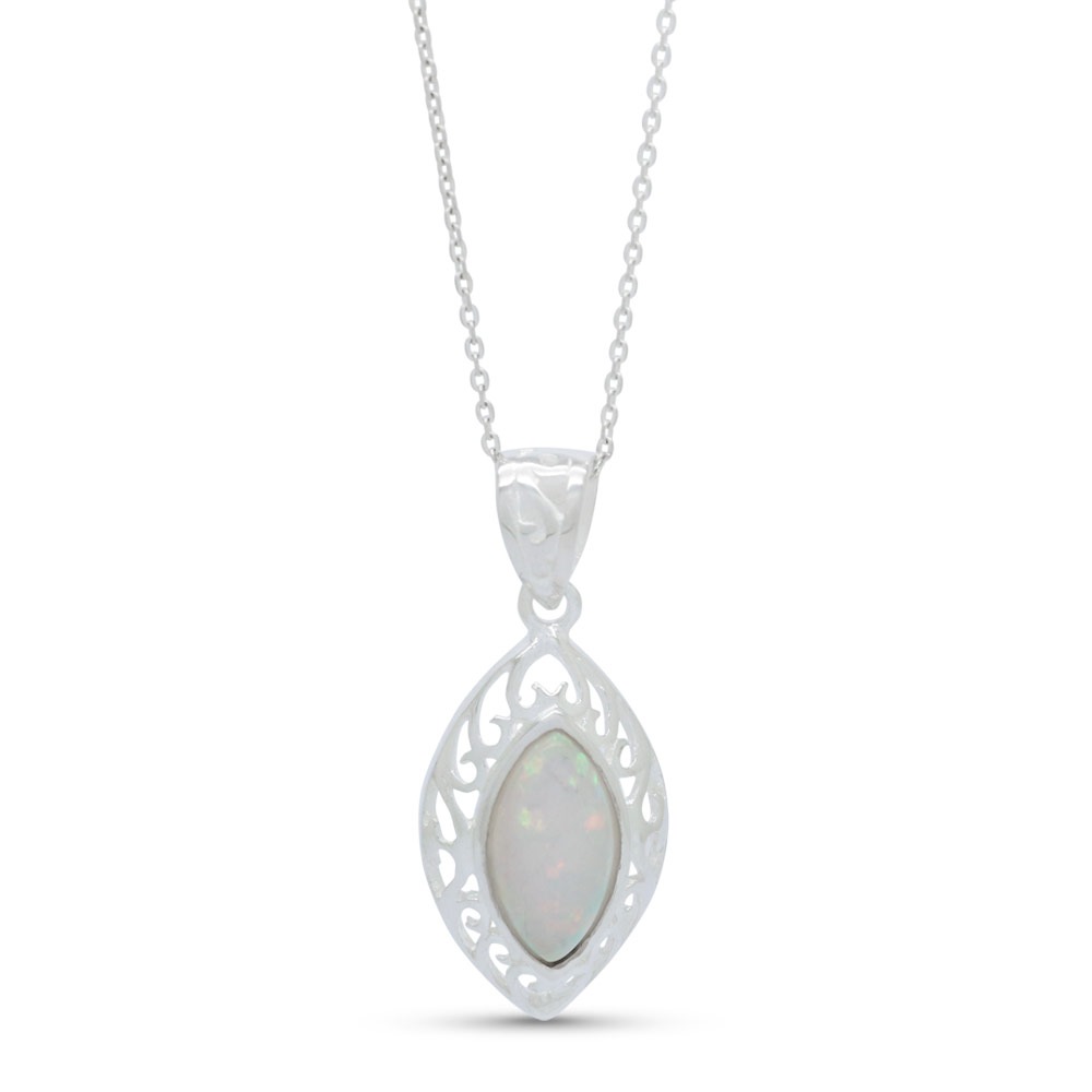 シルバーのペンダントトップにシンセティックオパールを嵌め込んだレディースネックレス。光の加減によって七色に輝くシンセティックオパールが美しい仕上がりになっております。シンプルで使いやすいアズキチェーンは5cmのアジャスター付きなので、40cm~45cmまでお好きな長さでご使用いただけます。