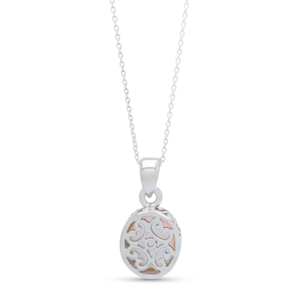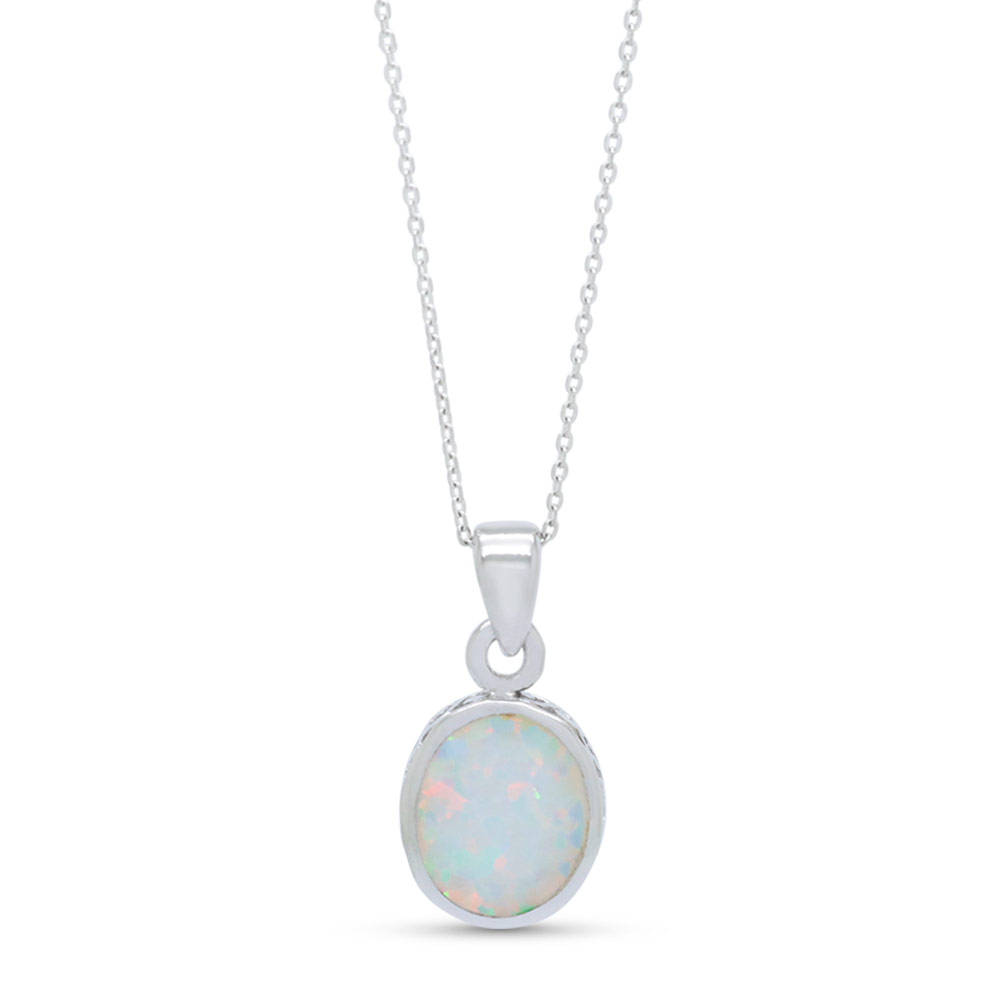 シルバーのペンダントトップにシンセティックオパールを嵌め込んだレディースネックレス。光の加減によって七色に輝くシンセティックオパールが美しい仕上がりになっております。シンプルで使いやすいアズキチェーンは5cmのアジャスター付きなので、40cm~45cmまでお好きな長さでご使用いただけます。