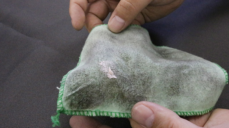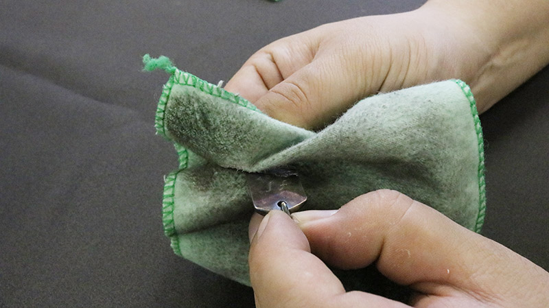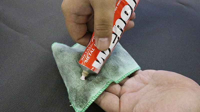 ステップ1)使い古しのウエスにコンパウンドを少量取り、変色したシルバーにまんべんなく擦り付けます。この際、銀表面を研磨しておりますので様子を見ながら擦ってください