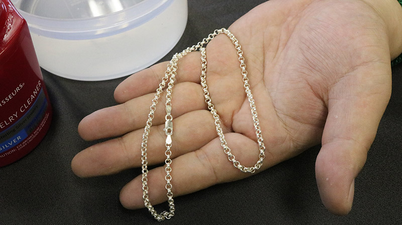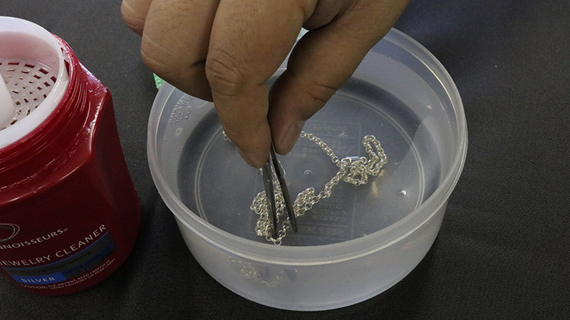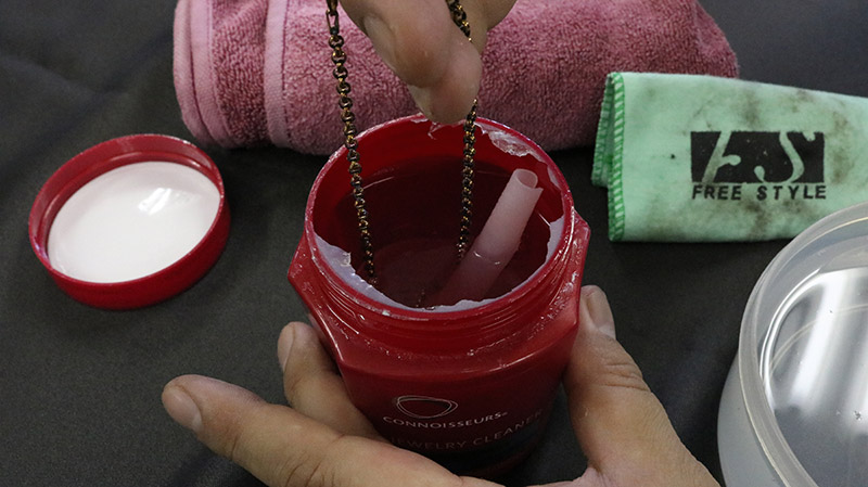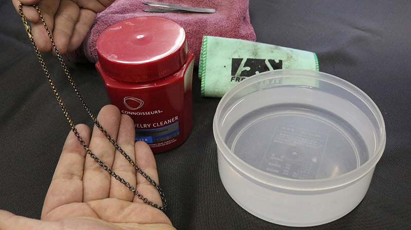 チェーンなどの磨き辛い作品には、市販の液体クリーナーが効果的です。シルバー表面の黒色硫化膜を除去するのに有効な手段です。本来意図的にアンティーク感を出した作品(いぶし仕上げ)の風合いも取り除いてしまいますのでご注意が必要です。