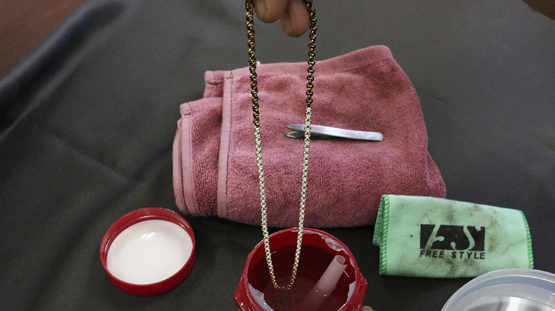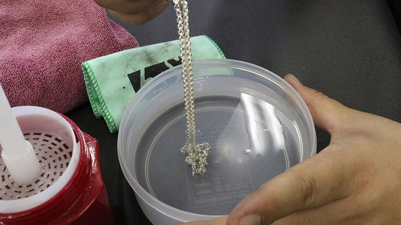 ステップ1)変色したシルバーを液体クリーナーに漬ける。その際気泡などを取り除く為によく混ぜてください。
